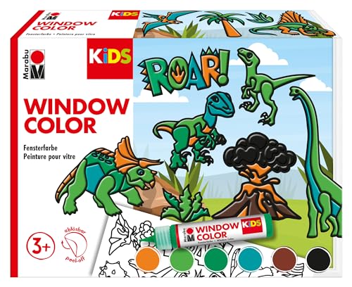 Marabu 30600004 - Kit de Peinture pour vitres Kids Dinosaures, 6 x 25 ML de Peinture pour vitres à Base d'eau, 2 x pochoirs A3 et A4, 30 Motifs, pour Enfants à partir de 3 Ans
