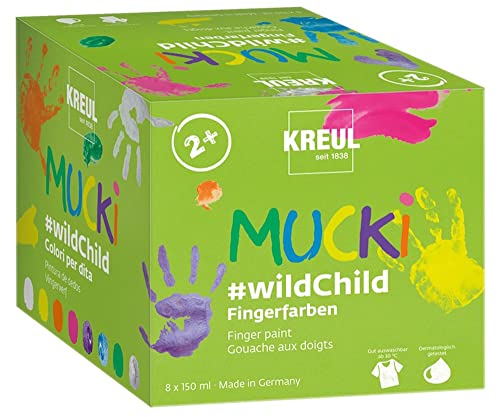 KREUL 2305 - Mucki Peinture Doigts Premium Wild Child, 8 x 150 ml peinture à base d’eau en blanc, jaune, orange, rose, violet magique, bleu diamant, vert, argent dragon, pour enfants dès 2 ans