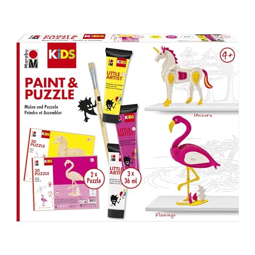 Marabu 0305000000111 - Kids Little Artist Set Flamingo & Licorne, boîte de Peinture et de Puzzle avec 2 Figurines d'animaux, 3 x 36 ML de Peinture, végétalien, pour Enfants à partir de 4 Ans