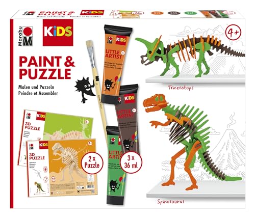 Marabu 0305000000110 - Kids Little Artist Set Dinos, boîte de Peinture et de Puzzle avec 2 Figures d'animaux, 3 x 36 ML de Peinture, végétalien, pour Enfants à partir de 4 Ans