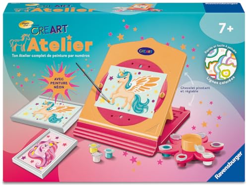 Ravensburger – CreArt Atelier Néon – Peinture par Numéros Enfant Dès 7 Ans – 2 Tableaux Licorne Effet Néon – Chevalet Rechargeable – 25991