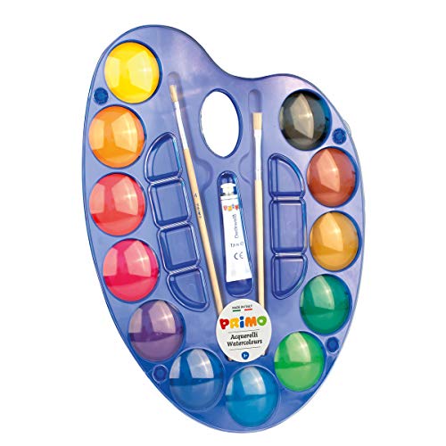 PRIMO Jumbo - Aquarelle Peinture Enfant +5 Ans, 12 Couleurs Ø44mm + 2 Pinceaux Aquarelle + 1 Tube Peinture Gouache Blanche, Kit Palette Peinture Enfants Feutre Aquarelle Loisirs Créatifs Made in Italy