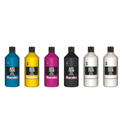 Marabu Color Big Pack, 6 x 500 ML, Peinture Acrylique crémeuse à Base, séchage Rapide, résistante à la lumière et à l'eau, à appliquer au Pinceau et à l'éponge sur Toile, Papier et Bois, Multicolor