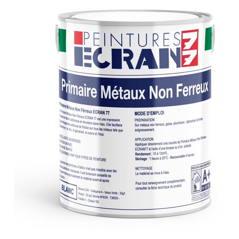 Primaire métaux non ferreux, peinture sous-couche aluminium, zinc, cuivre, métaux galvanisés, intérieur, extérieur ECRAN 77 Blanc 5 litres