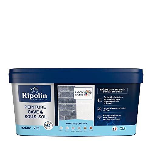 RIPOLIN - Peinture Cave & Sous-sol Intérieur - Résiste à Contre-pression de L'eau - Anti-Suintements & des Moisissures - Microporeuse - Anti-infiltrations - Lessivable - Satin - 2,5L - Blanc