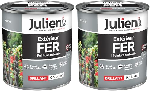 Julien Peinture Fer Anti-Rouille Brillant - Portes, grilles, portails, mobilier de jardin en métal - Gris Acier 0,5 L (Lot de 2)