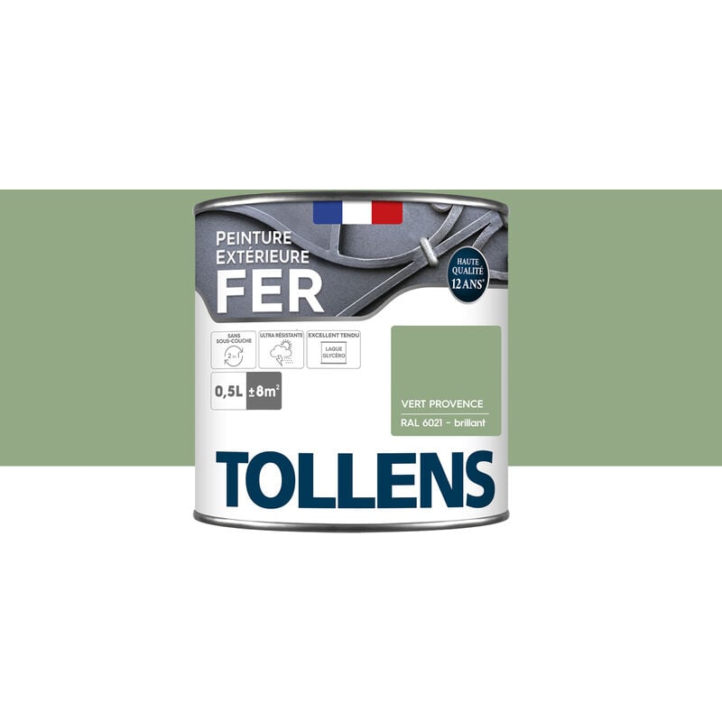 Tollens - Peinture fer extérieure 2 en 1 - Ultra Résistante, séchage rapide et antirouille Brillant - Vert Provence - 0,5L = 8m2