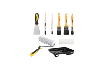 KIT 9 Outils Peinture Bac peinture Rouleau mur sablés +recharge 3 pinceaux plats 2 pinceaux Spatule acier