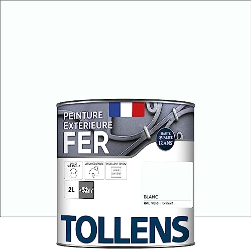 Tollens - Peinture extérieure fer 2 en 1 - Ultra Résistante - Protection antirouille - Laque Riche en Résine - Sans Sous-Couche - Entretien Facile - Brillant - Blanc - 2L = 32m2