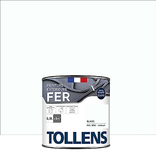 Tollens - Peinture extérieure fer 2 en 1 - Ultra Résistante - Protection antirouille - Laque Riche en Résine - Sans Sous-Couche - Entretien Facile - Brillant - Blanc - 0,5L = 8m2