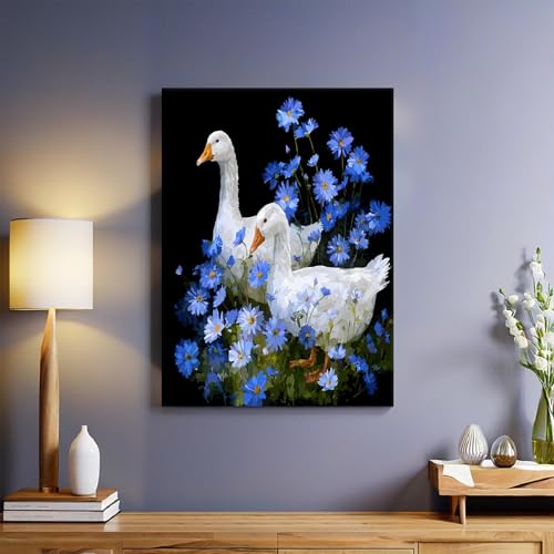 Jardin Peinture sur toile Oie blanche avec marguerite bleue Tableau décoratif mural 40x30 cm Impression haute définition Cadre bois Décoration élégante pour salon chambre maison