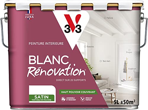 V33 Peinture blanche mur et plafond satinée - multi-supports - monocouche - BLANC RENOVATION®, 5L