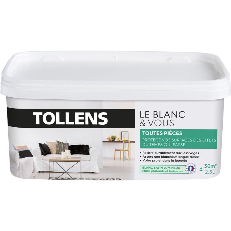 Tollens - Peinture Blanche Satin - Toutes Pièces - Murs, Plafonds, Boiseries - Blancheur Longue Durée - Résiste aux Chocs - Séchage Rapide - Fabriqué en France - Blanc - 2,5L = 30m2