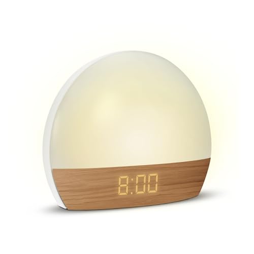 mooov 477356 Réveil simulateur d'aube Lumiere Progressive sur Secteur - Luminothérapie Eclairage Blanc ou Couleur - Charge Port USB-A - Effet Naturel Bois