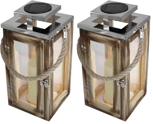 Lanterne Solaire Chic en Bois Naturel et INOX Effet Bougie LED Blanc Chaud Oaky H28cm (Lot de 2)