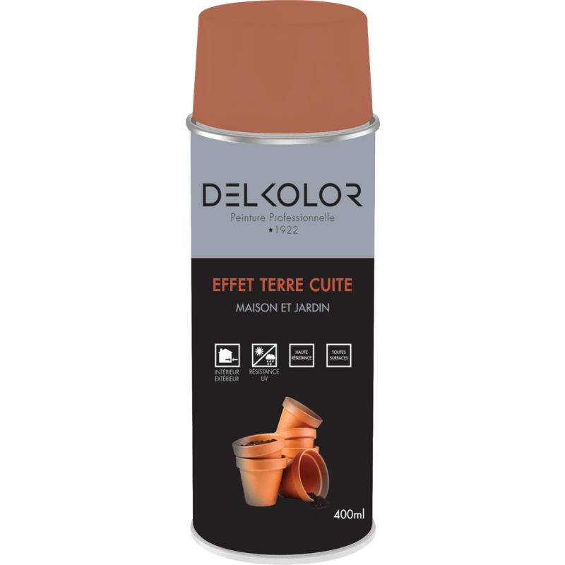 Peinture aérosol effet terre cuite 400ml – Finition terracotta mat – Résistante aux UV et intempéries – Pour bois, métal, céramique, verre – Delkolor