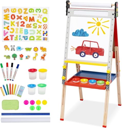 Chevalet Peinture Enfant Tableau Double Face Tableau Blanc et Noir en Bois et Hauteur Réglable avec Rouleau de Papier,Convient aux Filles et aux Garçons âgés de 3 à 8 Ans (Rouge)