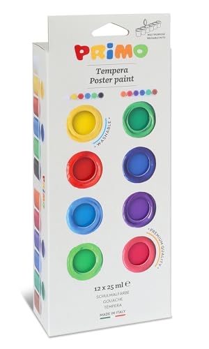 PRIMO - Kit Palette Peinture Enfant +3 Ans avec Peinture Gouache 25 ml, 12 Couleurs Tempera Couvrantes pour Peinture Textile, Aquarelle, Coloriage et d'Autres Surfaces, Loisirs Créatifs Made in Italy