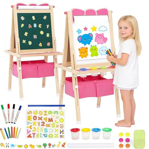 Chevalet Peinture Enfant Tableau Double Face Tableau Blanc et Noir en Bois et Hauteur Réglable avec Rouleau de Papier,Convient aux Filles et aux Garçons âgés de 3 à 8 Ans (Rose)