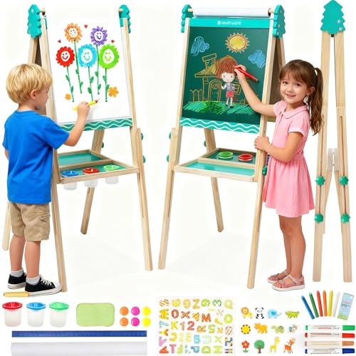 Chevalet Peinture Enfant Tableau Double Face Tableau Blanc et Noir en Bois et Hauteur Réglable avec Rouleau de Papier,Convient aux Filles et aux Garçons âgés de 3 à 8 Ans (Bleu)