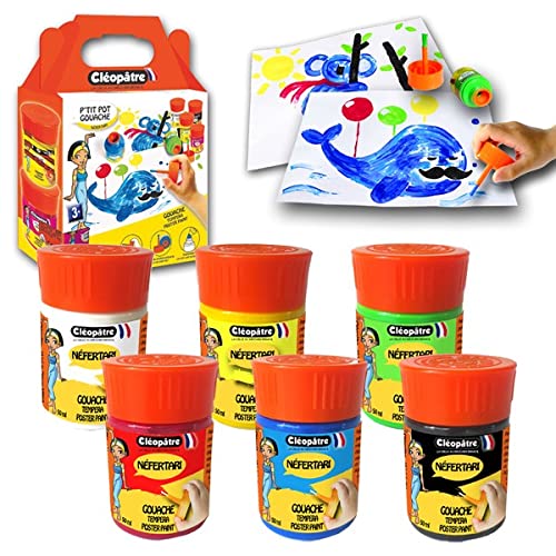 CLEOPATRE - Lot de 6 Pots de Peinture Gouache (Blanc, Noir, Bleu Primaire, Jaune Primaire, Magenta, Vert Printemps) avec Pinceau Intégré Format 50ml – Rentrée des classes - Fabrication Française