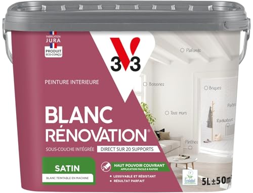 V33 Peinture blanche mur et plafond satinée - multi-supports - monocouche - BLANC RENOVATION®, 5L