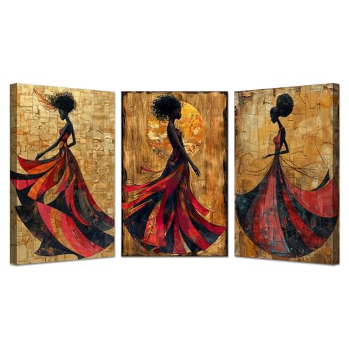 JOSUE Lot De 3 Africaine Tableau Femme noire abstraite Tableau Sur Toile,Rouge, noir Peinture Image Tableau Salon DéCoration Murale- 60x80cmx3 Encadrée