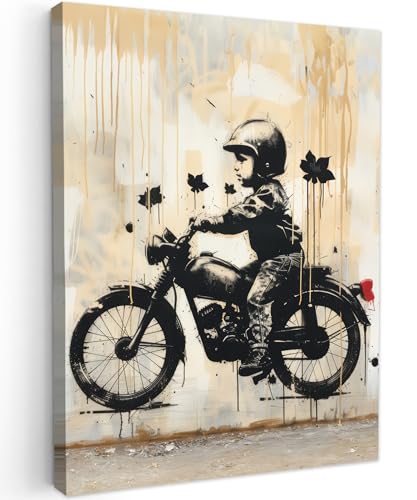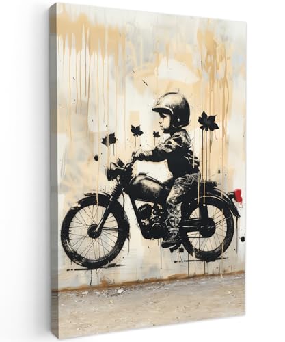 MuchoWow© Impressions sur Toile 80x120 cm Deco Tableau Murale Decoration Salon Peinture Tableaux Chambre Toiles Maison Vintage - Street art - Moto - Garçon - Graffiti - Noir - Banksy