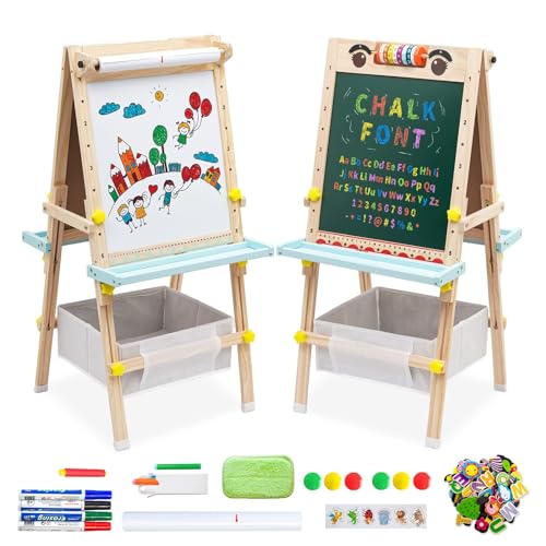 Chevalet Peinture Enfant Double Face en Bois,avec Rouleau de Papier Tableau Blanc et Tableau Noir avec Chiffres et Autres Accessoires,Hauteur Réglable,Jouets Éducatifs Cadeaux Enfants 2 3 à 12 Ans
