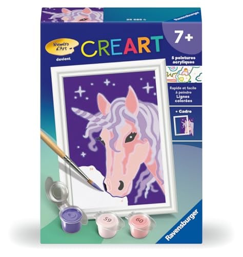 Ravensburger - CreArt Série E : Uniconios amoureux, kit de peinture par numéros, contient une planche pré-imprimée, un pinceau, des couleurs et des accessoires, jeu créatif pour enfants de 7 ans et