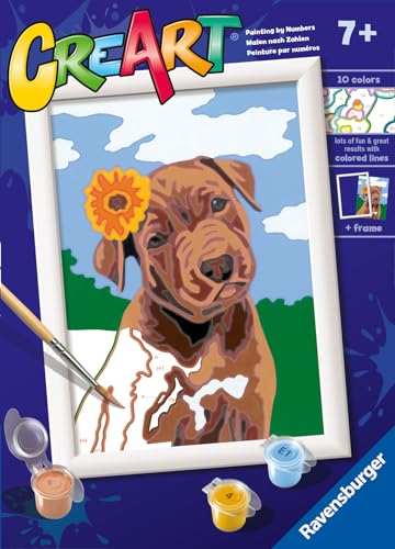 Ravensburger - Creart E : Chiot avec fleur | Peinture par numéros enfants | Kit de peinture pour enfants complet | Artisanat fille 7 ans | Comprend un cadre 13 x 18 cm