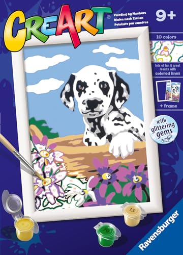 Ravensburger CreArt Série E Classic : dalmatien avec fleurs, kit de peinture par numéros, contient une planche pré-imprimée, un pinceau, des couleurs et des accessoires, jeu créatif pour enfants de 9