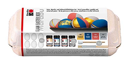 Marabu 1402000000082 Lot de 4 pots de peinture Glam Easter Box, pierre, effet métallisé et soft touch pour pinceaux et pois, 4 x 15 ml de peinture décorative, œufs en plastique, pinceau et pinceau de pochoir
