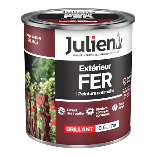 Julien Peinture Fer Anti-Rouille Brillant - Portes, grilles, portails, mobilier de jardin en métal - Rouge Basque 0,5 L