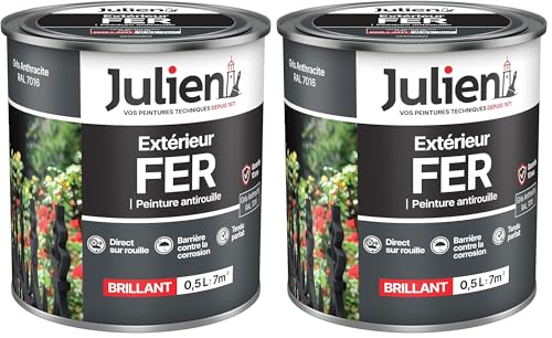 Julien Peinture Fer Anti-Rouille Brillant - Portes, grilles, portails, mobilier de jardin en métal - Gris Anthracite 0,5 L (Lot de 2)
