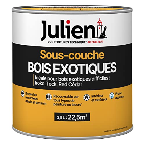 Julien Peinture Sous-couche Bois exotiques- Bloque les remontées d'huiles et tanin des bois exotiques et résineux - Satin Incolore 2,5L