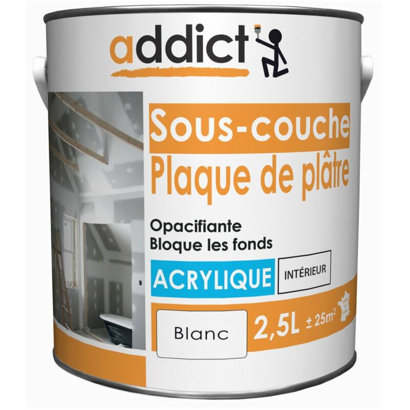 Peinture sous-couche acrylique 2.5 litres blanche – Super opacifiante – Lessivable et sans odeur – Pour supports plâtre, béton, briques – Addict