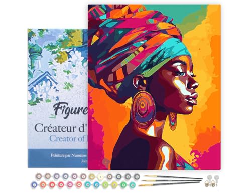 Figured'Art Peinture par Numéro Adulte avec Cadre Dame africaine lumineuse - Activité Manuelle Kit de Loisir Créatif DIY Numéro d'Art Complet - 40x50cm toile tendue sur châssis