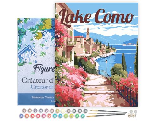Figured'Art Peinture par Numéro Adulte avec Cadre Affiche de voyage lac de Côme en fleurs - Activité Manuelle Kit de Loisir Créatif DIY Numéro d'Art Complet - 40x50cm toile tendue sur châssis