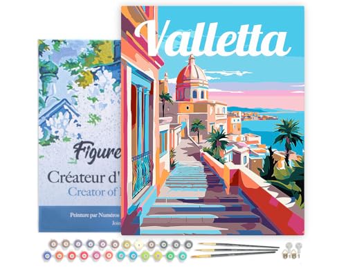 Figured'Art Peinture par Numéro Adulte avec Cadre Affiche de voyage Valette - Activité Manuelle Kit de Loisir Créatif DIY Numéro d'Art Complet - 40x50cm toile tendue sur châssis