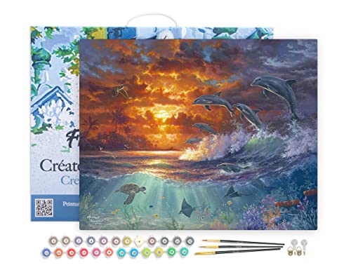 Figured'Art Peinture par Numéro Adulte avec Cadre Aube de Dauphins - Activité Manuelle Kit de Loisir Créatif DIY Numéro d'Art Complet - 40x50cm toile tendue sur châssis