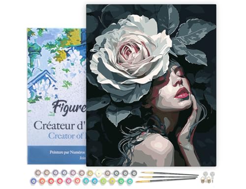 Figured'Art Peinture par Numéro Adulte avec Cadre Femme à la Rose - Activité Manuelle Kit de Loisir Créatif DIY Numéro d'Art Complet - 40x50cm toile tendue sur châssis