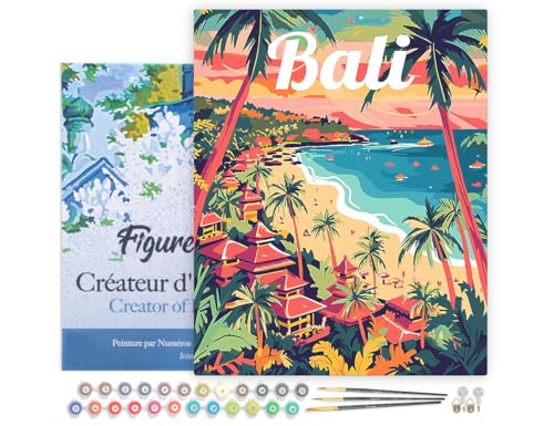 Figured'Art Peinture par Numéro Adulte avec Cadre Affiche de voyage Bali - Activité Manuelle Kit de Loisir Créatif DIY Numéro d'Art Complet - 40x50cm toile tendue sur châssis