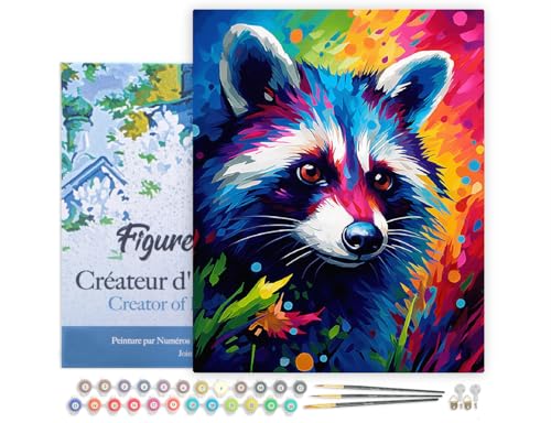 Figured'Art Peinture par Numéro Adulte avec Cadre Raton laveur Coloré Abstrait - Activité Manuelle Kit de Loisir Créatif DIY Numéro d'Art Complet Animaux - 40x50cm toile tendue sur châssis