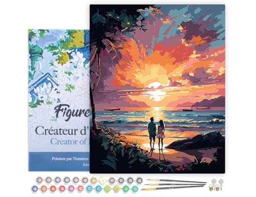 Figured'Art Peinture par Numéro Adulte avec Cadre Couple et coucher de soleil coloré - Activité Manuelle Kit de Loisir Créatif DIY Numéro d'Art Complet - 40x50cm toile tendue sur châssis