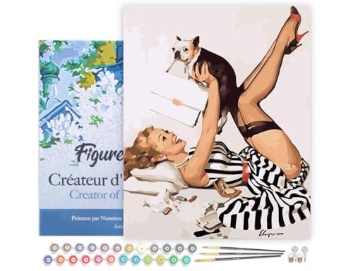 Figured'Art Peinture par Numéro Adulte avec Cadre Pin-up en robe et son chien - Activité Manuelle Kit de Loisir Créatif DIY Numéro d'Art Complet - 40x50cm toile tendue sur châssis