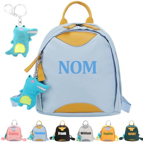Sac a Dos Personnalisé Enfant Prenom, avec Porte Clef Peluche Dinosaure, Nom Brodé, Sac Personnalisable Enfant, Sac a Dos Bebe Crèche Personnalisable pour Fille Garcon, Rentrée Scolaire (Bleu)