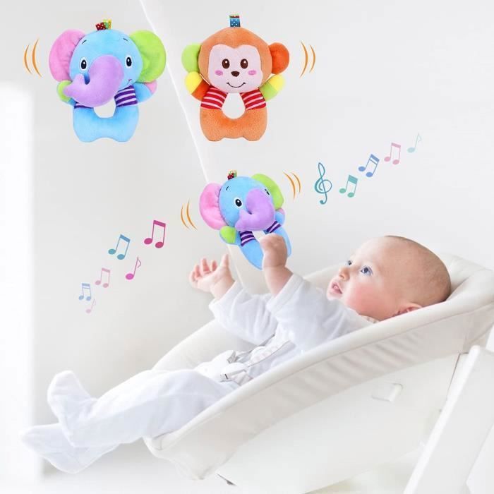 Hochet Bébé Jouet 2Pcs Jeux Bebe déveil Sensorielle Animale Doux Peluche Bebe Cadeau Naissance Garcon Fille(Singe léléphant)