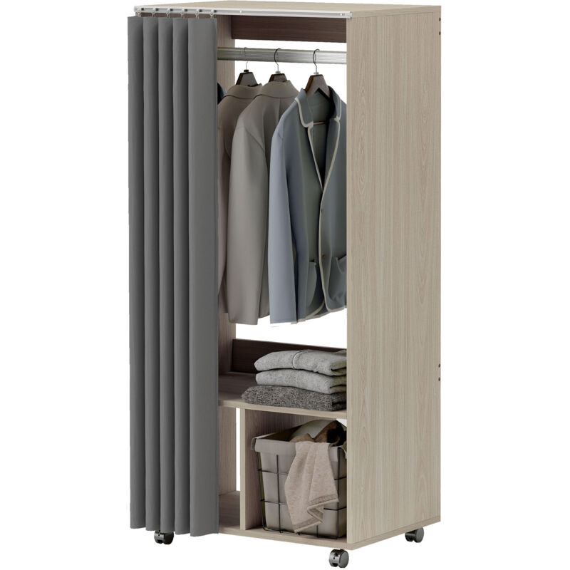 Armoire penderie - HOMCOM - avec rideau, 4 roulettes, tringle de suspension et étagères - 60 x 40 x 128 cm - effet bois naturel