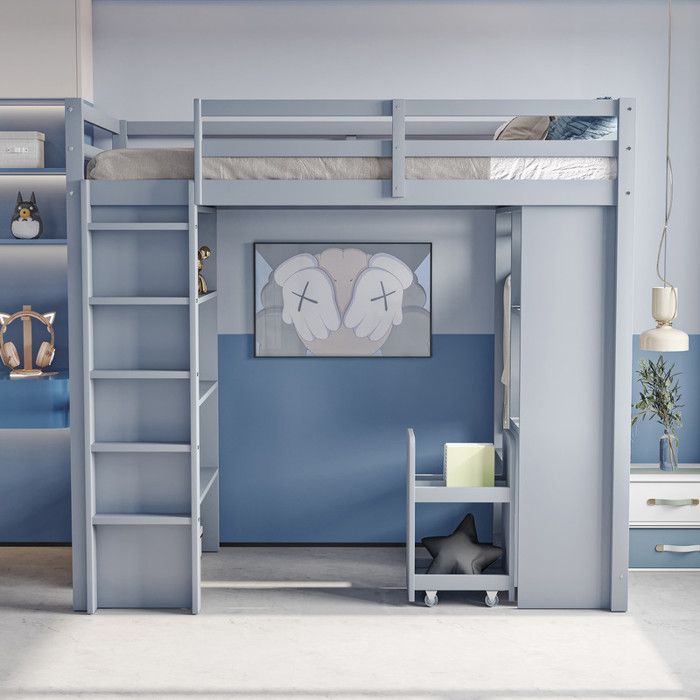 Lit mezzanine 90x200 cm - lit simple avec clôture, penderie et étagères - bois - sans matelas - gris